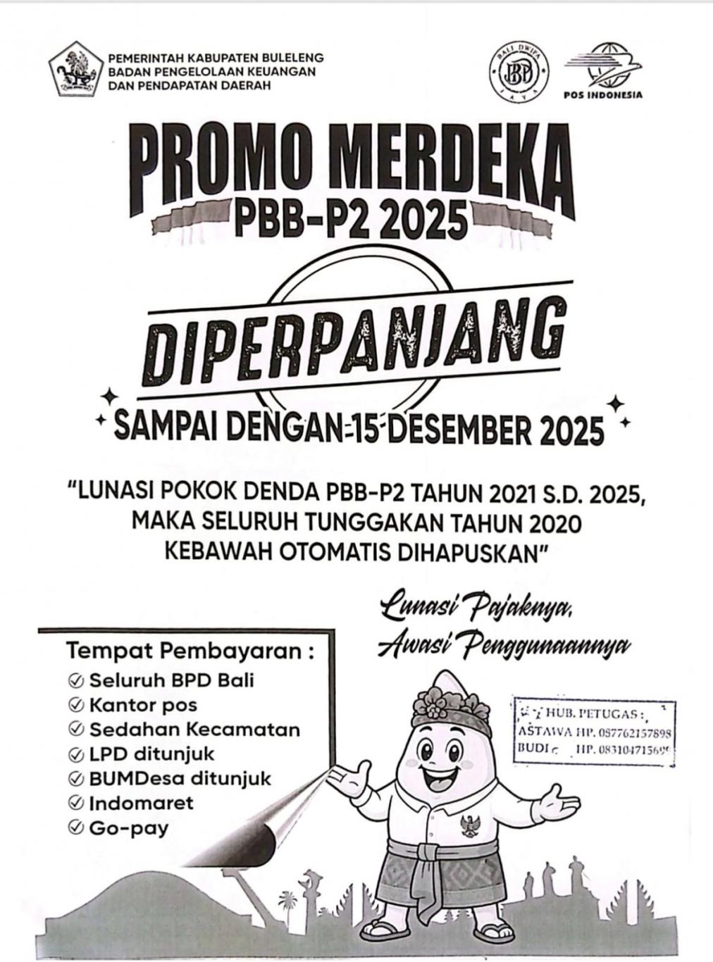 Buleleng – Pemerintah Kabupaten Buleleng melalui Badan Pengelolaan Keuangan dan Pendapatan Daerah (BPKPD) kembali memberikan kesempatan kepada masyarakat untuk memanfaatkan Program Promo Merdeka PBB-P2 Tahun 2025. Program ini resmi diperpanjang hingga 15 Desember 2025, guna memberi waktu lebih luas bagi wajib pajak dalam melunasi kewajiban pajak bumi dan bangunan pedesaan dan perkotaan (PBB-P2).