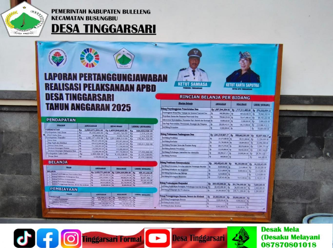 Desa Tinggarsari – Pemerintah Desa Tinggarsari melaksanakan pemasangan baliho atau spanduk Laporan Pertanggungjawaban Realisasi Pelaksanaan Anggaran Pendapatan dan Belanja Desa (APBDes) Tahun Anggaran 2025 sebagai bentuk transparansi dan akuntabilitas kepada masyarakat desa.